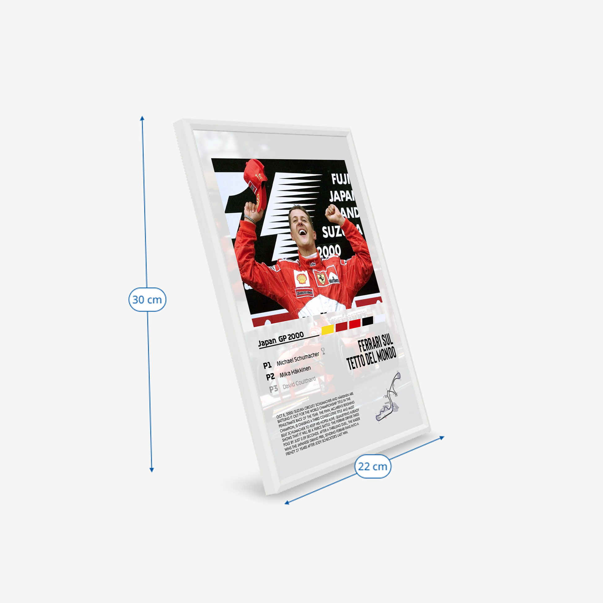 Elevate your space with our exclusive poster celebrating the the dramatic Japanese Grand Prix on October 8, 2000, at Suzuka, where Michael Schumacher won the World Championship for Ferrari.